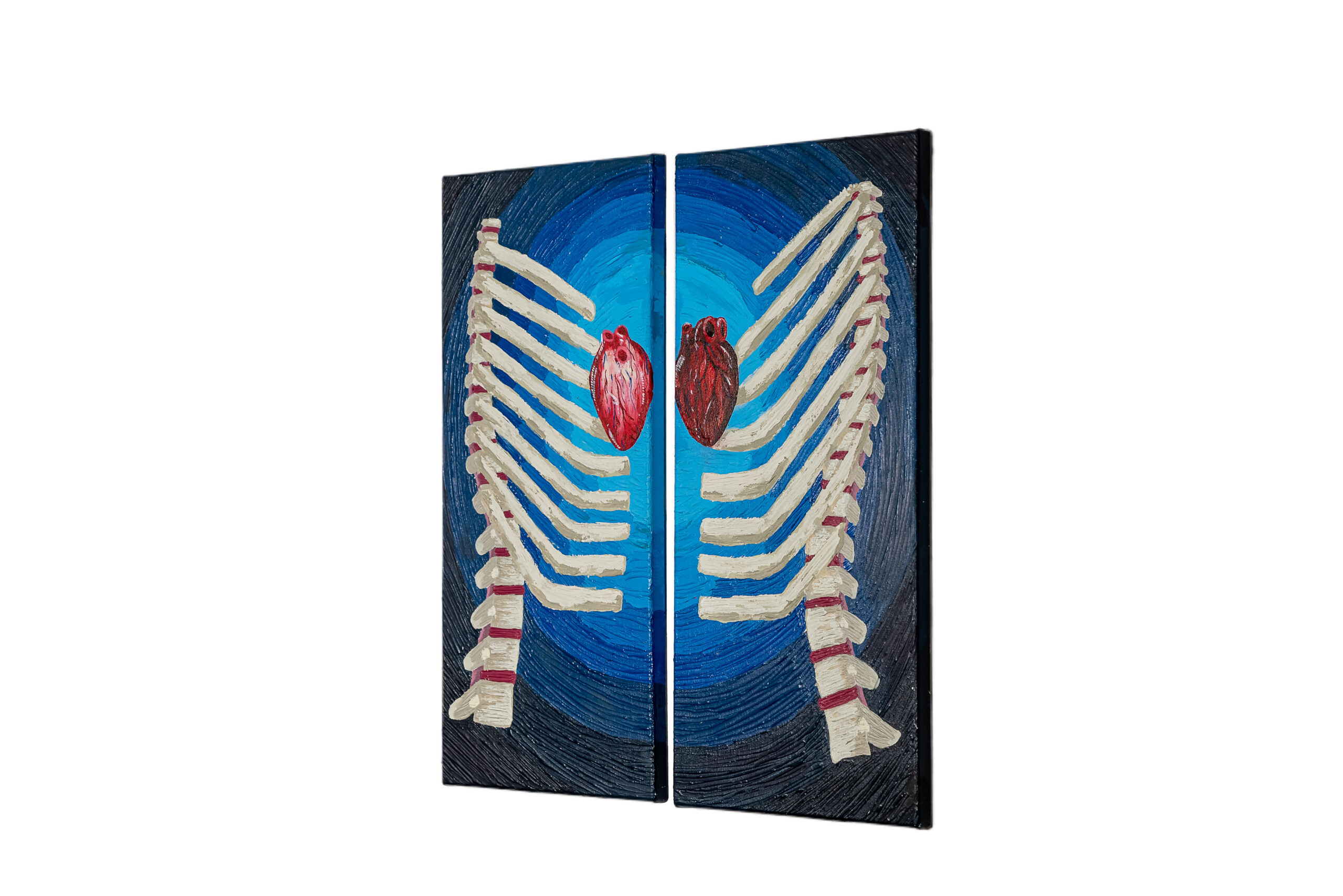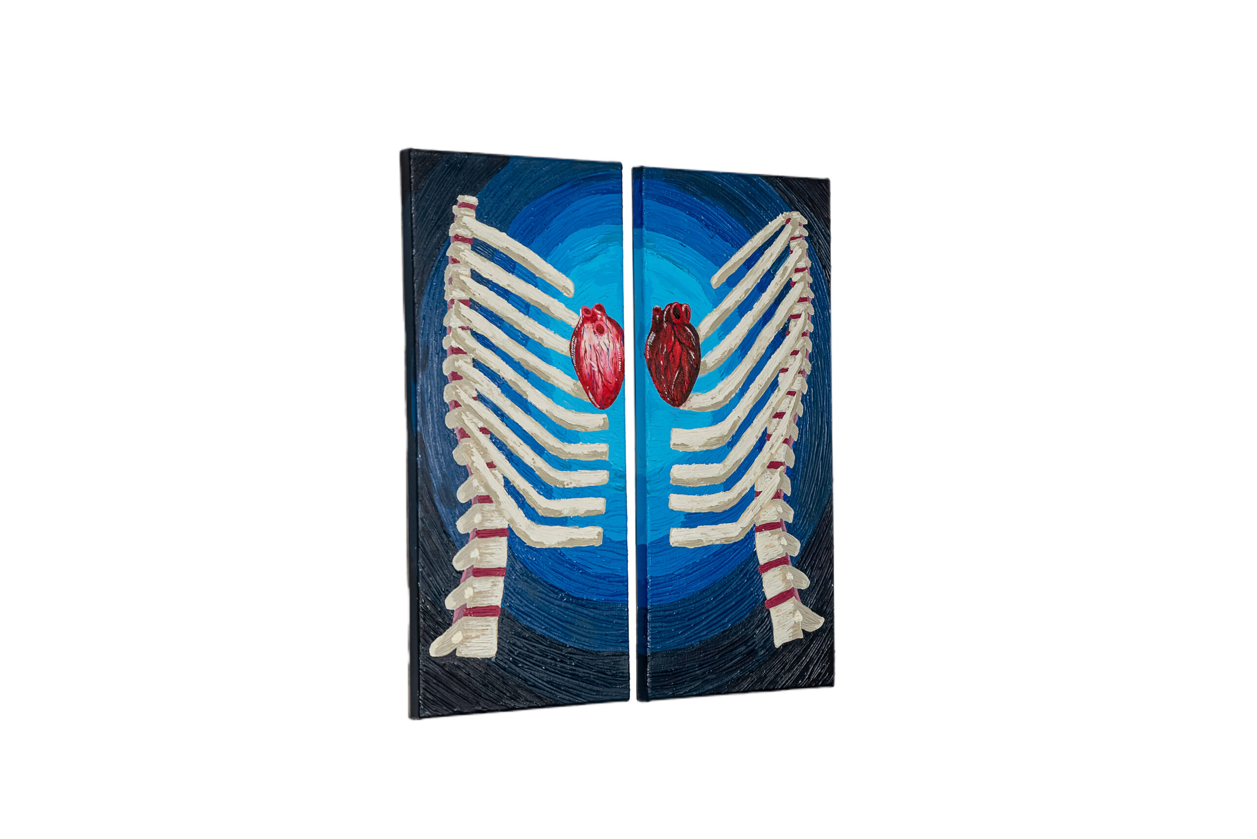 This diptych tackles a theme really close to my heart which is migration. The painting shows hearts coming out of their ribcage trying to be together again, but they are never going to be able to be together again since they are supported on different canvases. This is not only my reality, there are currently 5.6 millions of Venezuelans who are away from their families due to the humanitarian crisis.